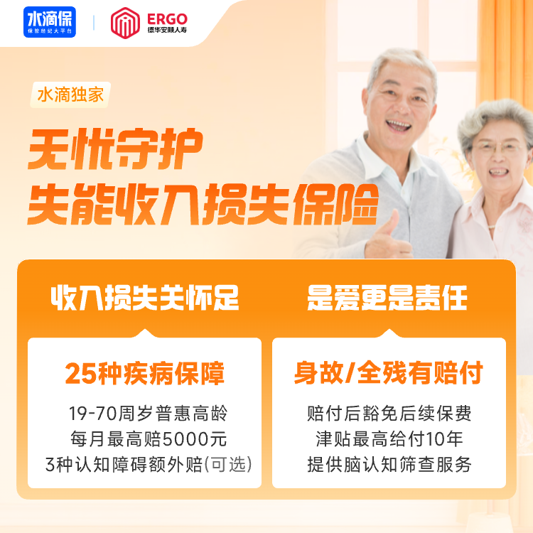 为更好保障老年人群,水滴保联合德华安顾人寿上线“无忧守护”失能收入补偿险,不仅可作为工作失能收入补偿,也可作为退休后的生活失能补偿。该产品投保年龄为19周岁至70周岁,最高可续保至90周岁,结节、息肉客户也有投保机会。保障严重阿尔茨海默病、严重原发帕金森疾病、严重脑中风后遗症等25种老年高发疾病,或因意外导致的1~3级伤残等级的情况。每月收入补偿金最高为5000元,无需每年做失能鉴定,可一直领取最高10年。