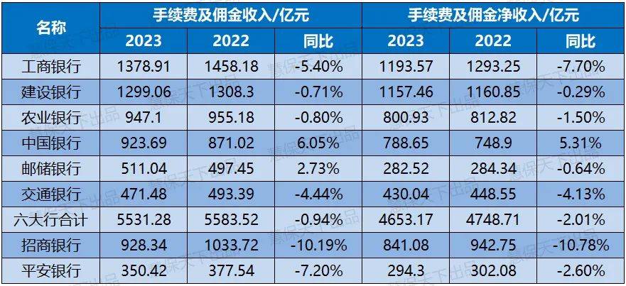 为了还原2023年银行业中间业务的写照,『慧保天下』对国有六大行及股份制银行中较有代表性的招商银行和平安银行的中收情况进行了梳理。