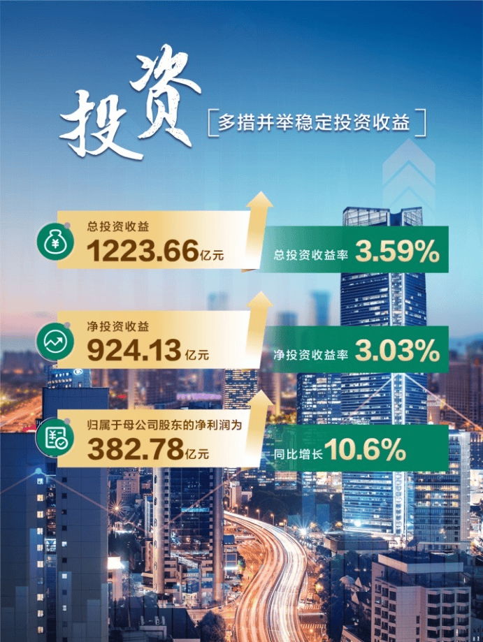 努力稳定整体收益水平。该公司将资产负债管理理念贯穿经营管理各环节,积极兼顾长期价值和短期效益,持续加强成本管控和承保管理。2024年上半年,总投资收益为1223.66亿元;归属于母公司股东的净利润为382.78亿元,同比增长10.6%。