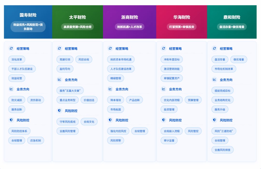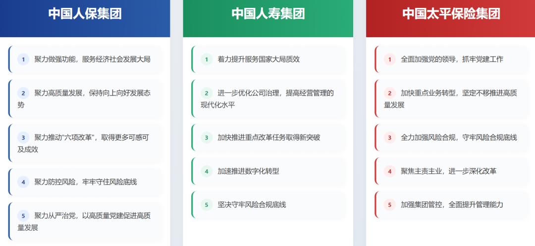 加强党的全面领导:党建与业务融合成为央企特色,无论是集团还是子公司,都反复提到以高质量党建促进高质量发展,党建与经营“两手抓、两促进”已经成为国有保险公司的基调。