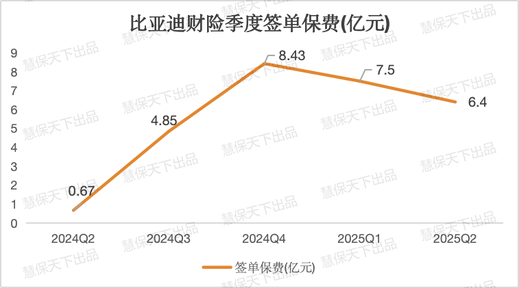 不过,一片大好之下,也有隐忧,最大的问题,是增长的天花板过早显现。比亚迪财险签单保费自去年四季度达到8.43亿元的高点后一直在下滑,2025年一季度、二季度,车险签单保费分别为7.5亿元、6.4亿元,已经连续两个季度走低。