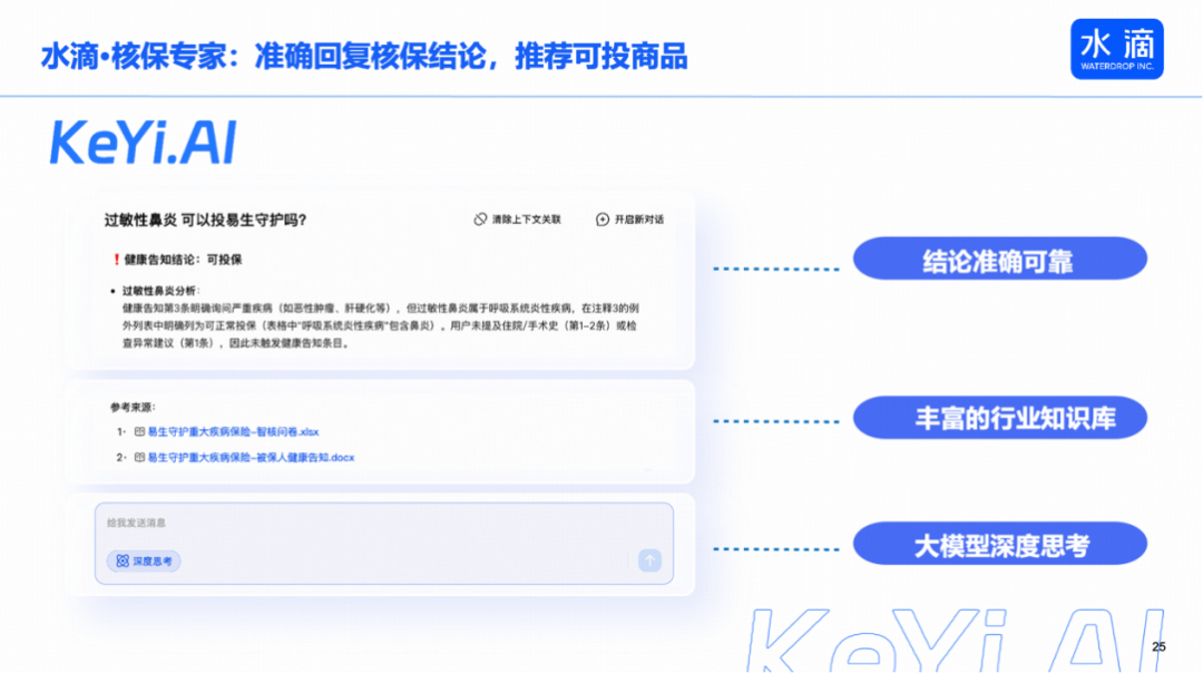 以水滴上线的首个AI保险核保专家“KEYI”为例,其依托AI大模型的深度思考能力,对上千款当期和历史热卖的保险产品条款、千万量级的医疗与核保知识数据进行分析,不仅能够实现秒级响应,将复杂健康险核保平均处理时间缩短80%,核保响应速度较此前提升260倍。