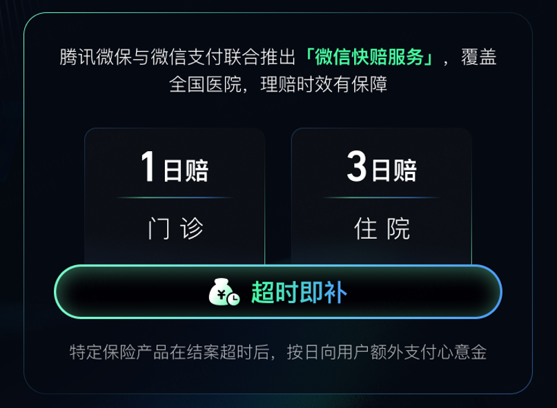 2025年,“微信快赔”同样迎来时效承诺再升级,理赔覆盖全国医院,实现门诊1日赔、住院3日赔。此外,“微信快赔”最新实行超时即补,特定保险产品一旦发生结案超时,平台将按日向用户额外支付心意金。