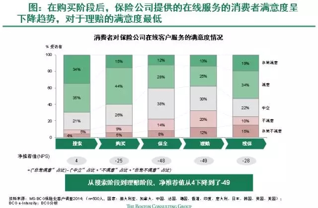 和产品开发、核保定价和市场推广销售相比,优化保险行业售后管理和服务是一个更长期的过程。摩根士丹利和BCG的联合调查发现,售后服务往往是整个流程中满意度最低的部分(参见下图)。这意味着保险公司需要优化现有的保单系统、完善理赔程序和提升增值服务。目前,售后服务的各个环节(包括保单管理、理赔、增值服务以及客服中心),均已开展了服务的线上化和智慧化创新。这些创新有助于保险企业提升运营效率、降低赔付率、提高客户满意度。