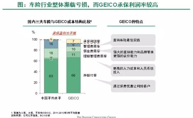 GEICO是美国最成功的直销保险公司。GEICO只有线上、电话等直销渠道,这让其运营成本远低于传统保险公司,从而使其可以承受比传统公司更高的赔付成本并仍然保持盈利。2015年GEICO的综合费用率约为15%,赔付率约82%,承保利润达2%。GEICO轻人力的运营模式和数字化的营销模式是车险直销的业界标杆,为传统保险公司发展直销业务提供了重要的借鉴意义。