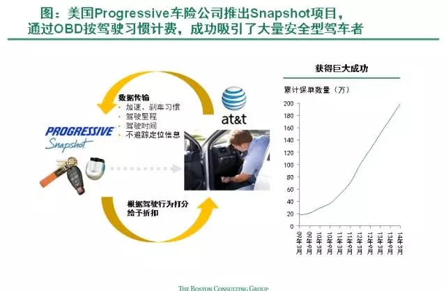 自90年代中期以来,Progressive的Snapshot就是美国领先的车联网保险产品(参见下图)。它提供免费的OBD设备以收集车辆行驶的里程、加速减速、转弯、驾驶时间等数据。通过对这些数据的分析,可以给客户最多给予30%的保费折扣,以奖励少开车、行车安全以及在安全时段驾驶的驾驶员。