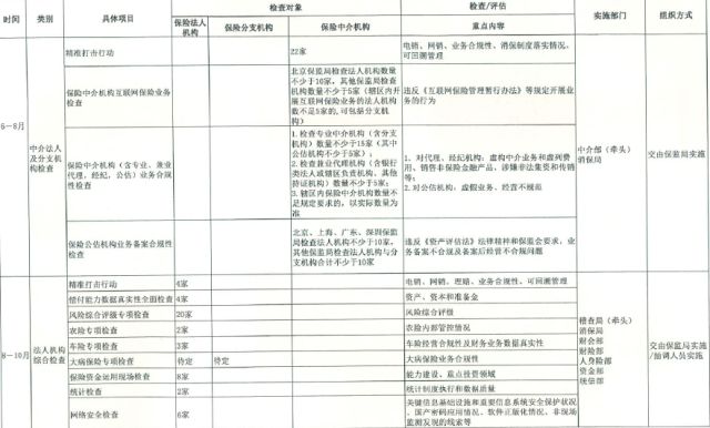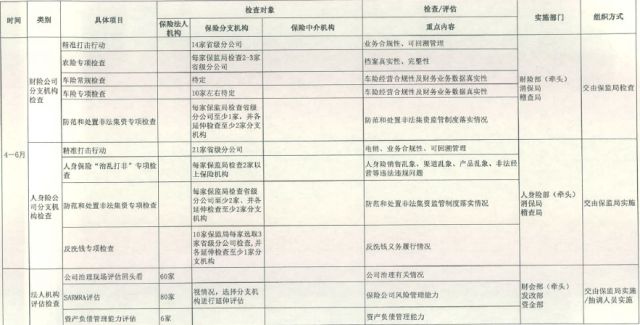 第1阶段(4-6月):开展财险公司分支机构检查、人身险公司分支机构检查等2项检查。