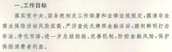 《方案》制定了明确的工作目标,即“摸清非法商业保险活动风险底数,严厉查处无牌照金融活动,旗帜鲜明打击非法、净化市场”。