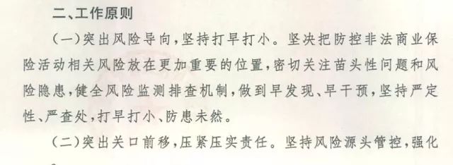 《方案》也同时明确了工作原则,即“坚决把防控非法商业保险活动相关风险放在更加重要的位置”,“强化保险机构防控风险的主体责任,禁止各类‘打擦边球’行为”。
