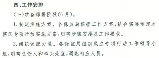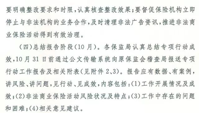 《方案》还制定了明确的工作计划,明确打击非法商业保险活动专项行动将一直从6月持续到10月,其中,6月为准备部署阶段;6月一7月为风险排查阶段;7月一9月为查处整改阶段;10月为总结报告阶段。
