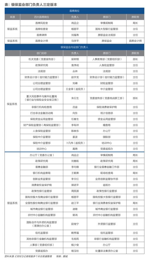 从具体的部门负责人来看,银保监会“三定”之后的27个部门中,原保监会局级干部将在其中的10多个部门担任一把手,包括所有直接与保险业务相关的部门,例如人身险部、财产险部、中介部、资金运用部、财务会计部(偿付能力监管部)等。此外,一些明显系原银监会、保监会合并而成的新部门,也由原保监会人士主导,例如政策研究局、法规部、公司治理监管部以及重大风险事件与案件处置局(银行业与保险业安全保卫局)等。整体来看,一些部门的人事安排颇有亮点,但也有个别部门的安排颇出人意料。