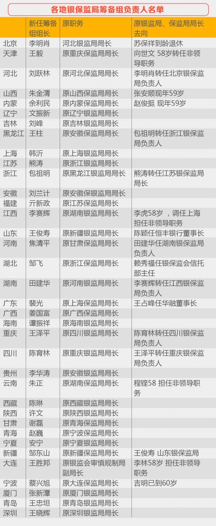 从目前媒体披露的名单来看,36个银保监局筹备组负责人中,原保监局局长占据了15席,其中5人在原所在地担任银保监局筹备组负责人,这其中就包括河北保监局局长刘跃林,山西保监局局长朱金渭、内蒙古保监局局长余利民、广西保监局局长姜国富,新疆保监局局长邹东山。另外10人则需赴异地担任筹备组负责人。