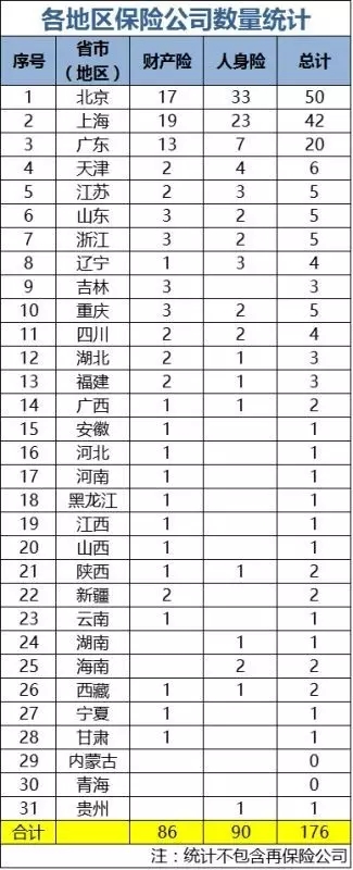 表1:大陆各个地区各有多少家保险公司(含已经批筹险企)