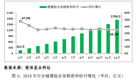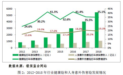 同时,在国民风险保障意识不断提升及人口老龄化进程加快的背景下,健康险、意外险等保障型业务潜力得到充分开发。2018年,行业健康险保费收入5444.5亿元,同比增长35.1%,占保险业总保费比重提升了2.3个百分点;意外险保费收入1075.6亿元,同比增长19.3%。