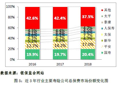 2018年,人身险公司各板块发展态势进一步分化,在回归保险保障本源背景下,以理财型产品、银行渠道为主导的中小公司市场占有率快速下降,而大型寿险公司则发挥传统优势,更加聚焦以个险渠道发展为核心的价值转型,大力发展保障型、长期储蓄型产品,不断加快业务转型和结构调整,市场集中度有所提升。