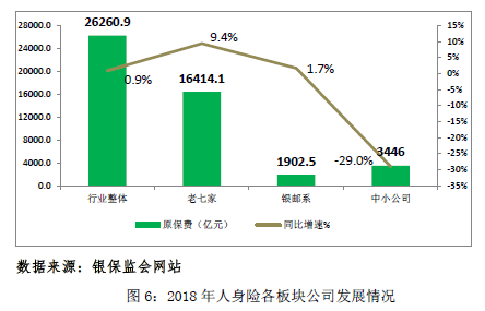 2018年,大型寿险公司发挥自身在产品、队伍、科技及生态圈布局的优势,转型升级占得先机。老七家寿险公司市场份额占比62.5%,较2017年底提升4.9个百分点,原保费收入共计1.6万亿元,同比增长9.4%,增速明显高于行业(0.9%)、银邮系(1.7%)和中小保险公司(-29%)。