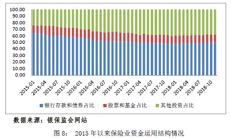 2018年,保险行业整体资金运用规模保持平稳增长达到16.4万亿元,较年初增长10%。从资产配置结构看,银行存款和债券占比49.2%,股票和证券投资基金占比11.7%,整体保持稳定。