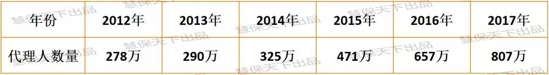 众所周知,为了响应国家的简政放权,2015年8月,保险监管部门彻底取消了保险营销员资格考试,转由保险公司自行组织考核,这导致2015-2017年间,保险营销员数量出现暴涨,截至2017年底,已经从2014年底的325万,增加到807万人。