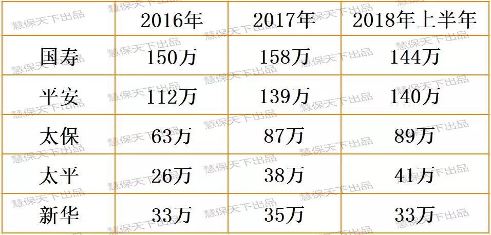 根据上市险企半年报以及其他媒体公开报道,截至2018年6月底,中国人寿个险渠道队伍规模达144万人,同比下降5.6%;平安人寿营销员规模140万人,同比增长5.5%;太平洋寿险月均保险营销员89万人,较2017年月均人力87万人略有上升;太平人寿保险营销员数量为41万人,同比增长6.6%;新华保险个险渠道人力规模33.4万人,同比下降4%。