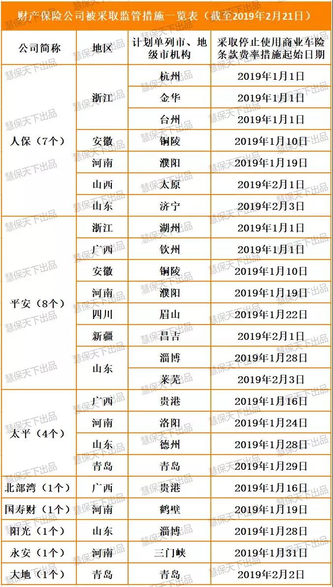 据介绍,截止2019年2月20日,浙江、广西、安徽、河南、四川、山东、青岛、新疆、山西等9地银保监局在查实公司未按规定使用报批的车险条款费率的违法违规行为后,先后对24个计划单列市和地市级保险机构采取停止商业车险条款和费率的监管措施。