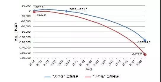 其实,上述的当期结余是在“大口径”(包括财政补助)情况下测算得到的。如果不考虑财政补助,即在“小口径”情况下,当期结余在2019年就已经是负值,而且下降的更快,到2050年为-16.73万亿元。