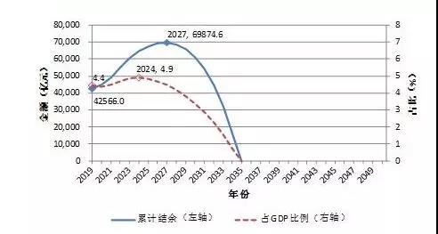 具体来看,2019年当期结余总额为1062.9亿元,短暂地增长到2022年,然后从2023年便开始下降,到2028年当期结余首次出现负数-1181.3亿元,最终到2050年当期结余坠落到-11.28万亿元。